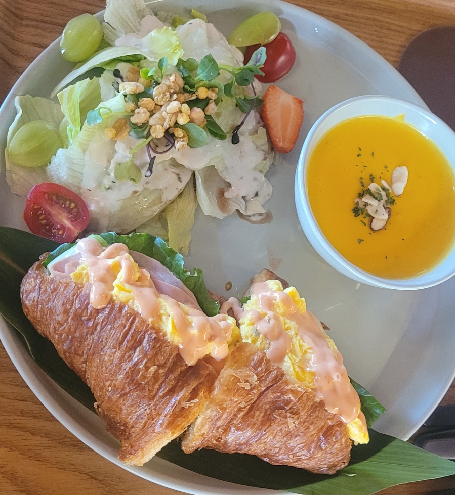 여기는 송이버섯 오므라이스가 유명하더라구요~ 그리고 저기 크루아상 샌드위치도 함께 시켜보았는데 단호박죽이 아주 맛있다고 해서 저기 보이는 저 두가지를 메뉴를 시켰답니다.^^